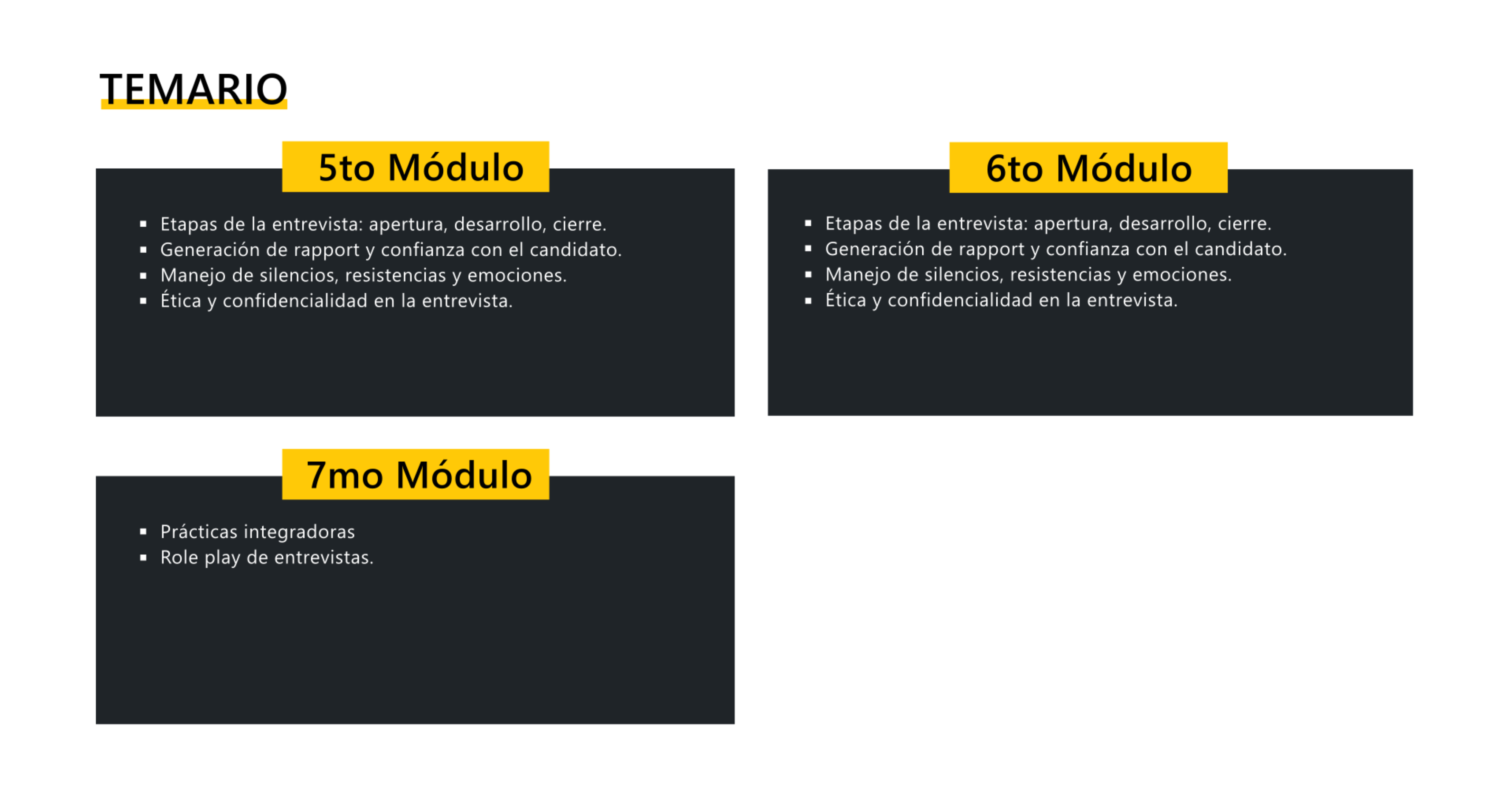 La formación culmina con role plays y prácticas integradoras, donde podrás aplicar todo lo aprendido, afinar tu criterio evaluador y ganar seguridad para entrevistar con una perspectiva más profunda, humana y basada en evidencias.