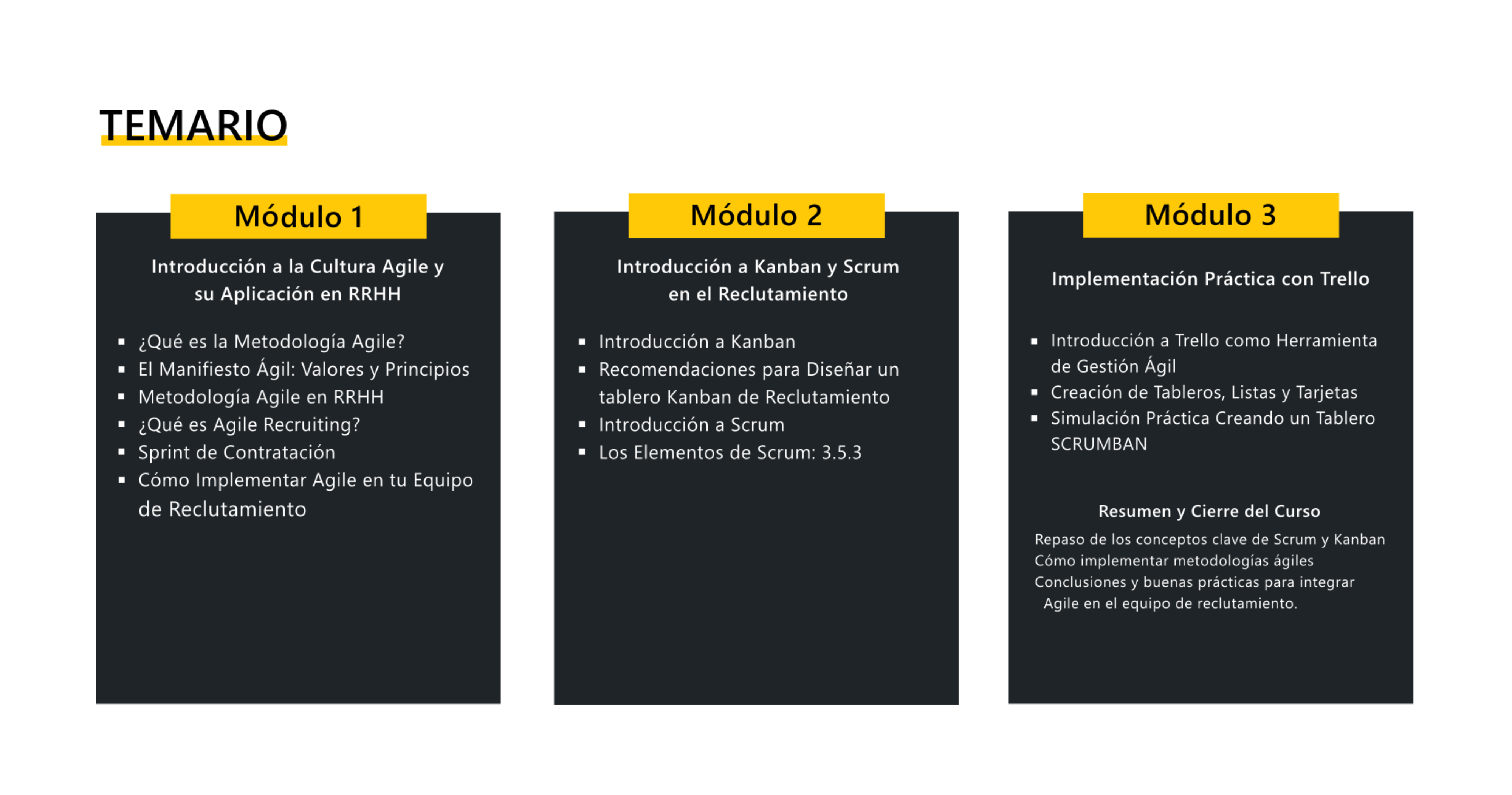 ¿Te imaginás aplicar la agilidad del mundo IT al área de Recursos Humanos? Este curso propone justamente eso: llevar las metodologías ágiles al reclutamiento para transformar la forma en que gestionamos los procesos de selección.